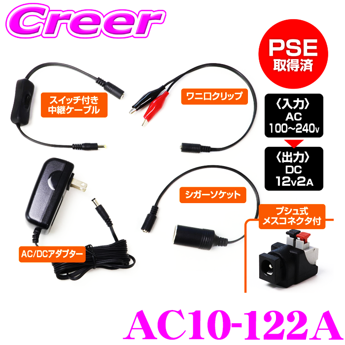 マックスウィン 汎用 AC-DCアダプター 12V 2A 出力 AC10-122A PSE取得 家電 シガーソケット ワニ口クリップ AC DC アダプター