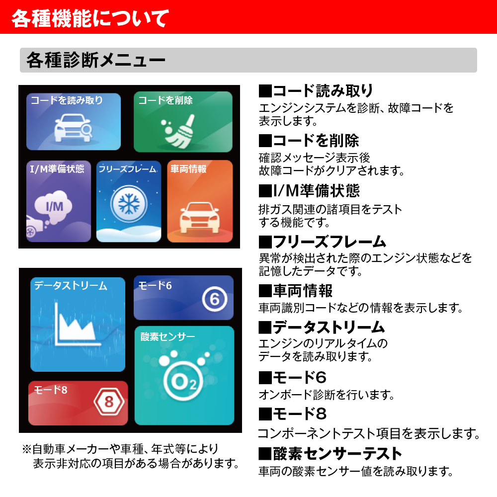 故障コード読み取り・クリア、フリーズフレームデータ読み取り、I/M準備状態、車両情報、データストリームの読み取り、電圧の読み取り、酸素センサーテスト、故障コード照会などをサポートしています。