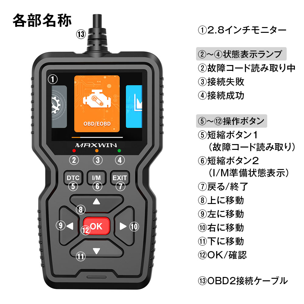 製品仕様 ■材質:ABS ■モニター:2.8インチ液晶ディスプレイ ■入力電圧:DC 9-16V ■動作電流:6mA-84mA ■動作温度範囲:-20℃〜60℃ ■保存温度範囲:-20℃〜60℃ ■サイズ:約155×87×24 mm ■重量:246g(本体) ■ケーブル長さ:約250cm ■表示言語:日本語含む10言語対応 ■内蔵エラーコード情報:約36000件 ■対応車種:OBD2機能搭載車に対応 (日本車:2005年〜、アメリカ車:1998年〜、ヨーロッパ車:2002年〜)対応プロトコル ■1. SAE J1850 PWM (41.6Kbaud) ■2. SAE J1850 VPW (10.4Kbaud) ■3. ISO 9141-2(5 baud init, 10.4Kbaud) ■4. ISO 14230-4 KWP (5 baud init, 10.4 Kbaud) ■5. ISO 14230-4 KWP (fast init, 10.4 Kbaud) ■6. ISO 15765-4 CAN (11bit ID, 500 Kbaud) ■7. ISO 15765-4 CAN (29bit ID, 500 Kbaud) ■8. ISO 15765-4 CAN (11bit ID, 250 Kbaud) ■9. ISO 15765-4 CAN (29bit ID, 250 Kbaud) |