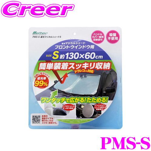 |  | ・大自工業の遮光マジカルシェード Sサイズ、PMS-Sです。 ・パッと広がり、サッとたため、シュッと収納できるサンシェードです。ドラレコにも対応します。 ・遮光率99%で、日射しをしっかりカットします。 ・収納袋に収納した後は、ドアポケットに収まります。また、収納袋はハンドルカバーとしても使えます。 ・本製品には、Mサイズ、Lサイズ、LLサイズもございます。 ※ドラレコの形状により、取付出来ない場合がございます。 ※適合目安につきましてはこちらからご確認をお願い致します。