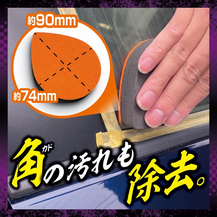 ・付属のティアドロップパッドと特殊研磨剤による相乗効果によって、フロントガラスの広い面や磨きにくい角の汚れも時間を掛けず徹底的に除去します。