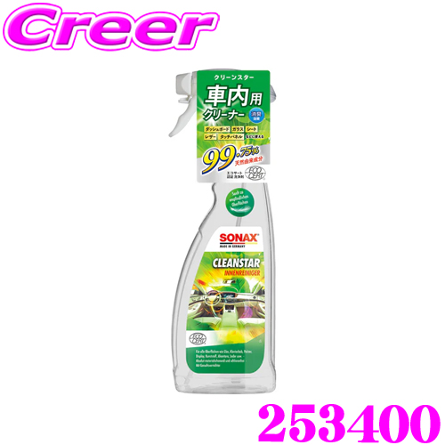 ・SONAXのクリーンスターエコサート、253400です。 ・車内インテリアのあらゆる表面(ガラス、布張り、プラスチック、アルカンターラ、レザーなど)に優しく使えるクリーナーです。 ・頑固な汚れも優しく落とし、心地よい爽やかな香りを残します。 ・ガラス面、繊細なタッチスクリーンディスプレイ、ピアノ塗装面の拭き跡を残さずきれいにするのにも最適です。消臭剤配合。