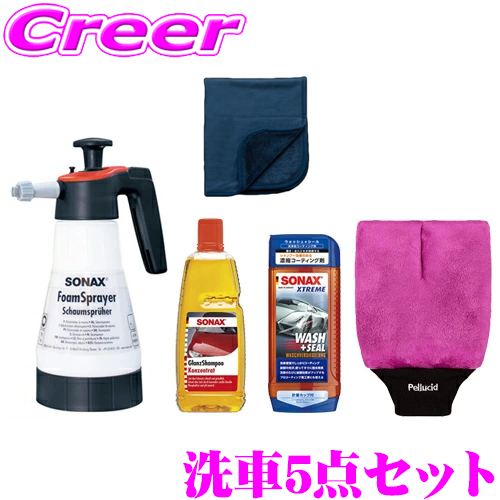 ・SONAXのフォームスプレイヤー 496541 、グロスシャンプー 314300 、エクストリーム ウォッシュ+シール 244200 と、ペルシード ウォッシンググローブ PCD-200 と、GYEONの シルクドライヤーエヴォM Q2M-SDE-M のセットです。