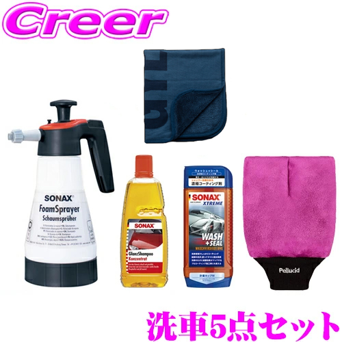 ・SONAXのフォームスプレイヤー 496541 、グロスシャンプー 314300 、エクストリーム ウォッシュ+シール 244200 と、ペルシード ウォッシンググローブ PCD-200 と、GYEONの Q2M-SDEB-M シルクドライヤー エヴォ ビッグロゴ Mのセットです。