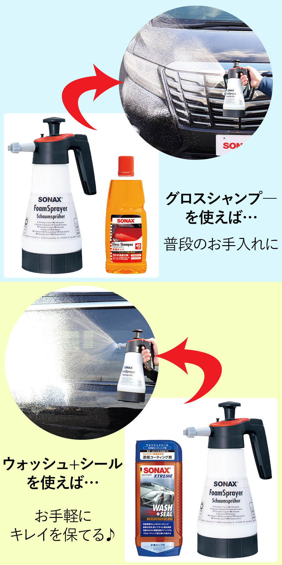 ポリマー加工車 / コーティング施工車 / 洗車 / 洗車用品 / 泡 / 水あか / 水垢 / 撥水 / コーティング / カーシャンプー / スプレー / ボトル / ソナックス / ノーコンパウンド / 中性 / お手入れ / メンテナンス / 濃縮 / GYEON / ペルシード / SONAX / ウォームガン / 洗剤 / 落とし