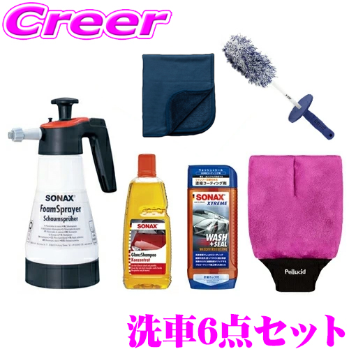 ・SONAXのフォームスプレイヤー 496541 、グロスシャンプー 314300 、エクストリーム ウォッシュ+シール 244200 と、ペルシード ウォッシンググローブ PCD-200 と、GYEONの Q2MA-WB-M ホイールブラシM 、シルクドライヤーエヴォM Q2M-SDE-M のセットです。