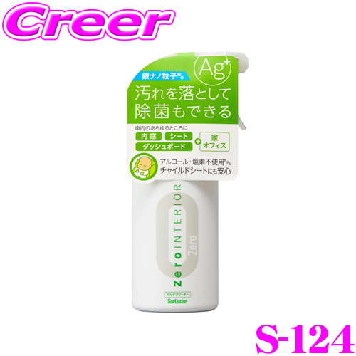 ・シュアラスターのゼロインテリア マルチクリーナー、S-124です。 ・スプレーして拭くだけで汚れをすっきり除去し、除菌・抗菌・防臭もできる銀ナノ粒子配合のクリーナーです。 ・布製シートやダッシュボード・プラスチック部品など幅広くご使用になれます。繊維やプラスチック類を傷めないやさしい洗浄成分配合、汚れもしっかり落とします。 ・銀ナノ粒子が雑菌の繁殖を抑制し、嫌なニオイを元から抑えます。また菌だけでなくカビにも効果を発揮する除菌剤を配合しました。 ・IPA(イソプロパノール)など有害なアルコールは無添加なので、チャイルドシートにも最適です。 ・容量:200ml