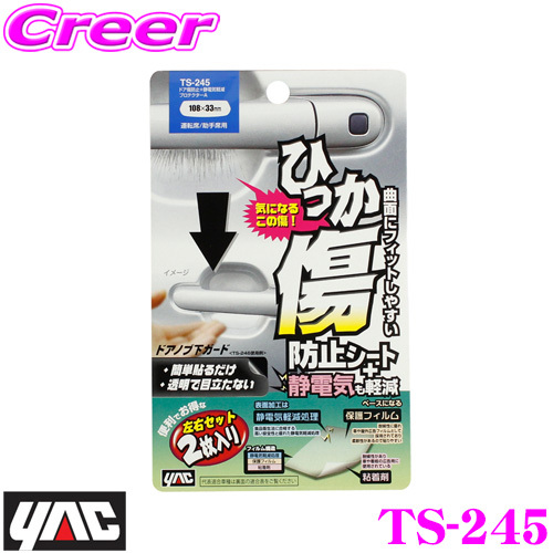 ・ヤックのドア傷防止+静電気軽減プロテクターA、TS-245です。 ・シート表面に帯電防止処理がされており静電気を軽減することができ、ドアノブ下に付く爪等によるひっかき傷を効果的に防ぐことも可能です。 ・曲面にフィットしやすく、透明で目立たない軟質素材を使用しています。