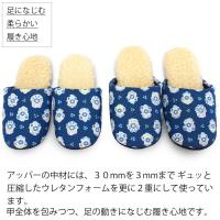 | 日本製。宮城県蔵王町にある自社スリッパ工場で一足一足丁寧に手づくりしています。 軽くて、消音効果もあります。 底には柔らかく滑りにくい素材を使用しています。 |