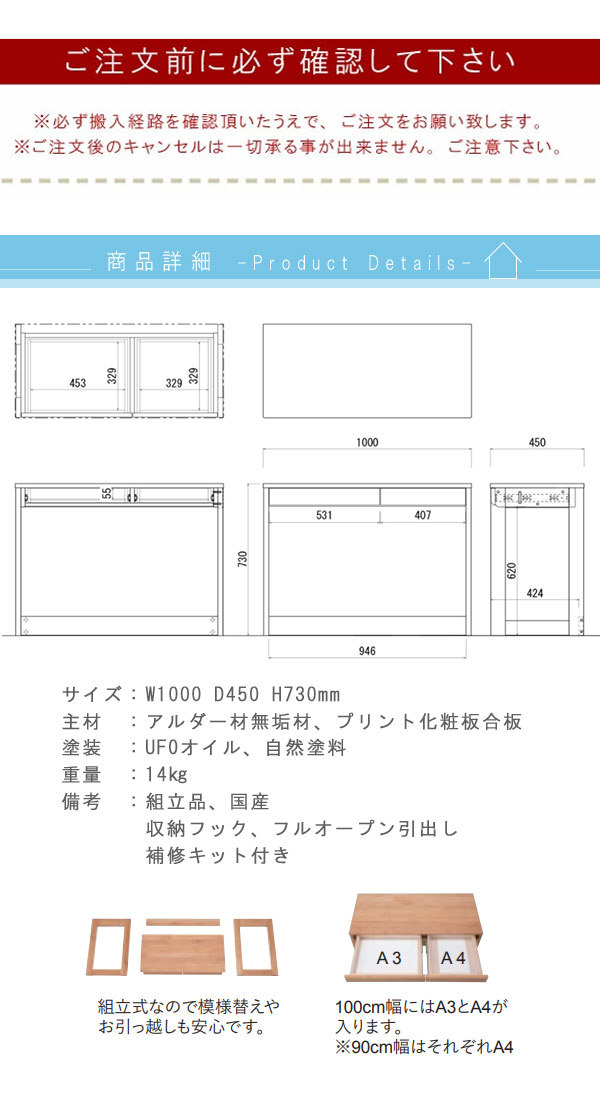 デスク のみ 幅100cm アルダー材 無垢材 引出し 日本製 国産 安心 木製 デスク 学習デスク パソコンデスク t003-m054-cal-de2 堀田木工 カルロ