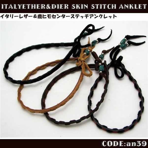 アンクレット イタリーレザー 鹿ヒモ センターステッチ レザーアンクレット メンズ レディース