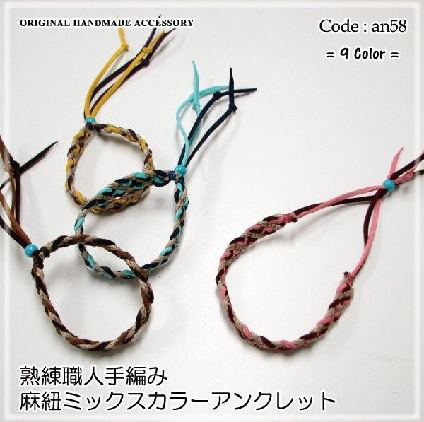 スエード風合皮紐と麻紐という、素材の異なる2種類の紐を使い熟練職人が1本1本丁寧に編み上げ、丈夫で使い易いアンクレットに仕上げました。