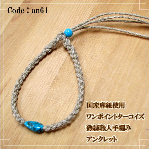 アンクレット ターコイズ 手編み 熟練職人 国産 麻紐 ワンポイント トルコ石 ヘンプ an61 メンズ レディース ペア