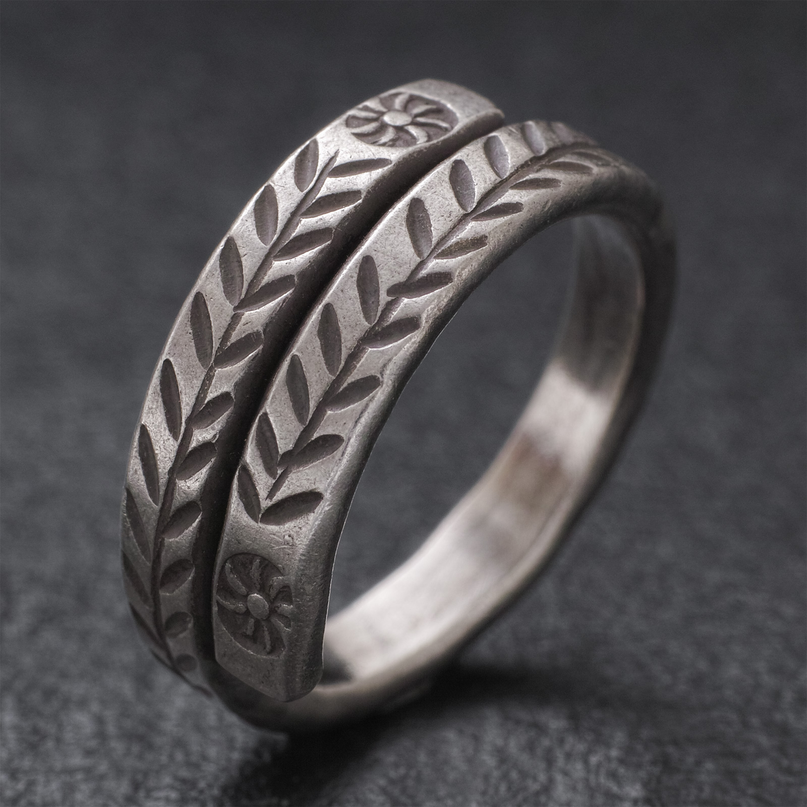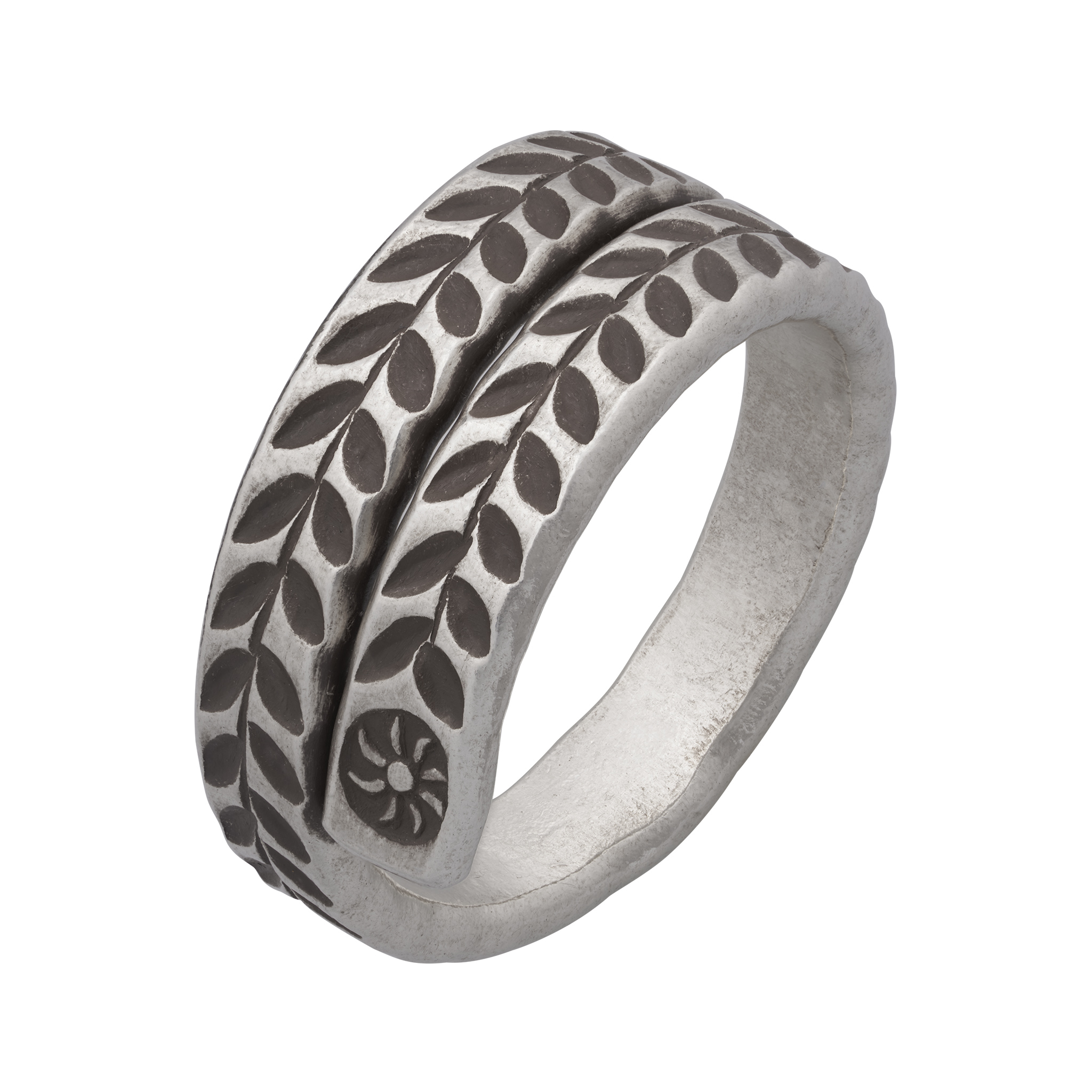 端から端まで施された植物文様葉を表す文様が一面に施された平打ちのカレンシルバーリングです。