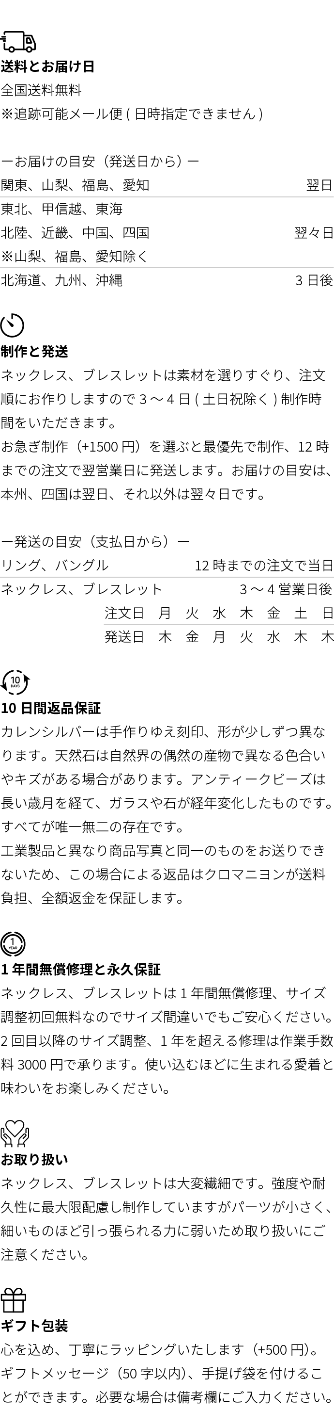 ※カレンシルバー、天然石、アンティークビーズは、それぞれの特性上、刻印や形、色合いや風合い、小さなキズなど個体差があります。素材や製法の特性としてご理解ください。