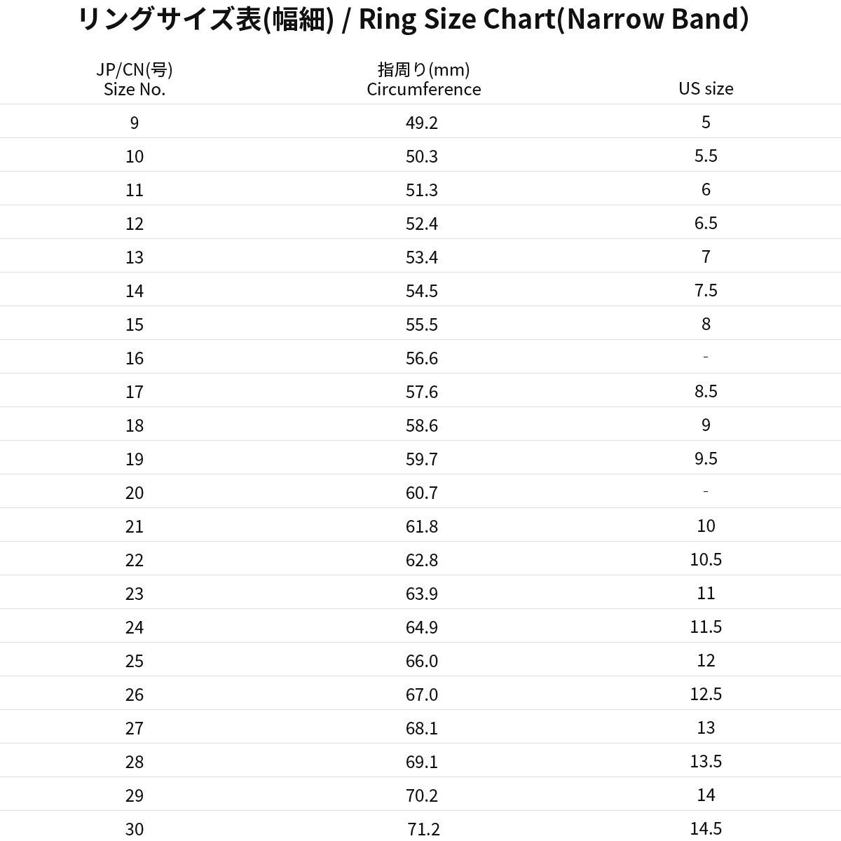 - 幅6mm以上の幅広リングは指を曲げたときに圧迫されるため、幅細用リングゲージで計測した場合の1号程上が快適に装着しやすいサイズとなります。
