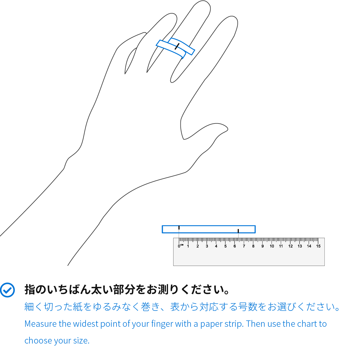 - 号数の測り方は、細く切った紙を指のいちばん太い部分に巻き付けて引っ張り、ゆるみが完全になくなった位置に印を付けてください。印の付いた2点間の長さが指周りです。リングサイズ表のいちばん近い指周りに対応する号数をお選びください。