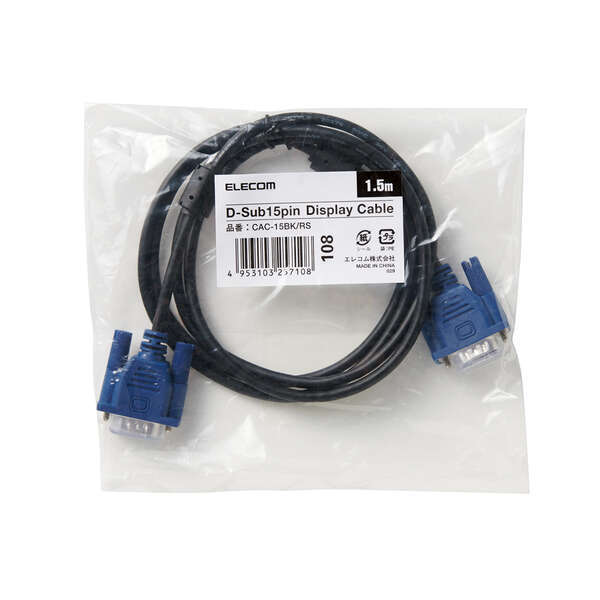 パソコンとディスプレイを接続する、D-Sub15ピン(ミニ)ケーブル。■対応機種:D-sub15ピン(ミニ)の入出力端子を持つPC、ディスプレイ及びプロジェクター ■コネクタ形状:D-sub15pin(ミニ)オス ■ケーブルタイプ:スリムタイプ(複合同軸) ■シールド方法:2重シールド ■ケーブル長:1.5m ■ケーブル太さ:約4.5mm ■カラー:ブラック ■環境配慮事項:EU RoHS指令準拠(10物質) ■その他:簡易パッケージ(PP袋)