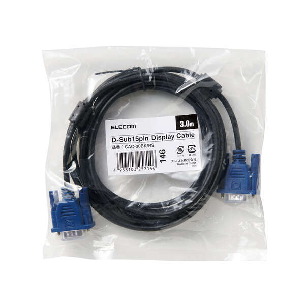パソコンとディスプレイを接続する、D-Sub15ピン(ミニ)ケーブル。■対応機種:D-sub15ピン(ミニ)の入出力端子を持つPC、ディスプレイ及びプロジェクター ■コネクタ形状:D-sub15pin(ミニ)オス ■ケーブルタイプ:スリムタイプ(複合同軸) ■シールド方法:2重シールド ■ケーブル長:3.0m ■ケーブル太さ:約4.5mm ■カラー:ブラック ■環境配慮事項:EU RoHS指令準拠(10物質) ■その他:簡易パッケージ(PP袋)