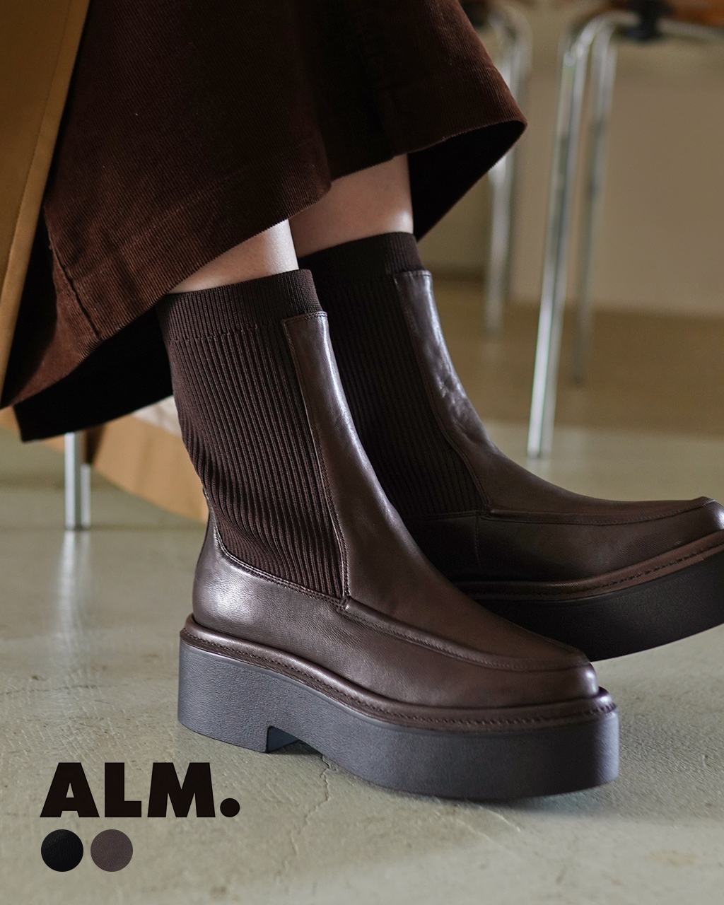 太めのリブが印象的なミドル丈のブーツ。リブ部分は靴下のようなフィット感で、歩きやすいうえに足首を華奢に見せてくれる効果も◎インパクトのある5.9cmの厚底ソールもポイントで、スタイルアップ効果はもちろん、コーディネートの幅も広げてくれます。プラットフォームデザインなので、安定感があり、履き心地もバッチリ。程良く艶のある本革がカジュアルすぎずモード感をプラスし、大人の女性にぴったりなブーツに仕上がっています。
