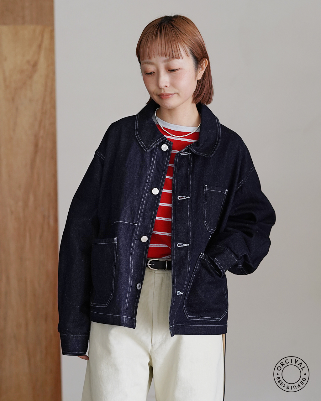 インディゴの深みを主役に、赤ボーダーでプレイフルなアクセント。クラシック回帰のムードを今の空気感で。ショート丈のバランスが、ワイドパンツを穿いたときの重心をすっきり整えます。