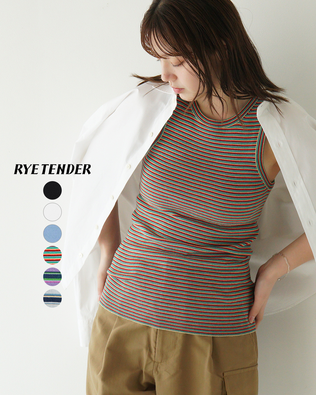 トップスにはマルチストライプのタンクをレイヤード。シンプルな中に視線を集める柄を一点取り入れることで、こなれた印象にアップデート。