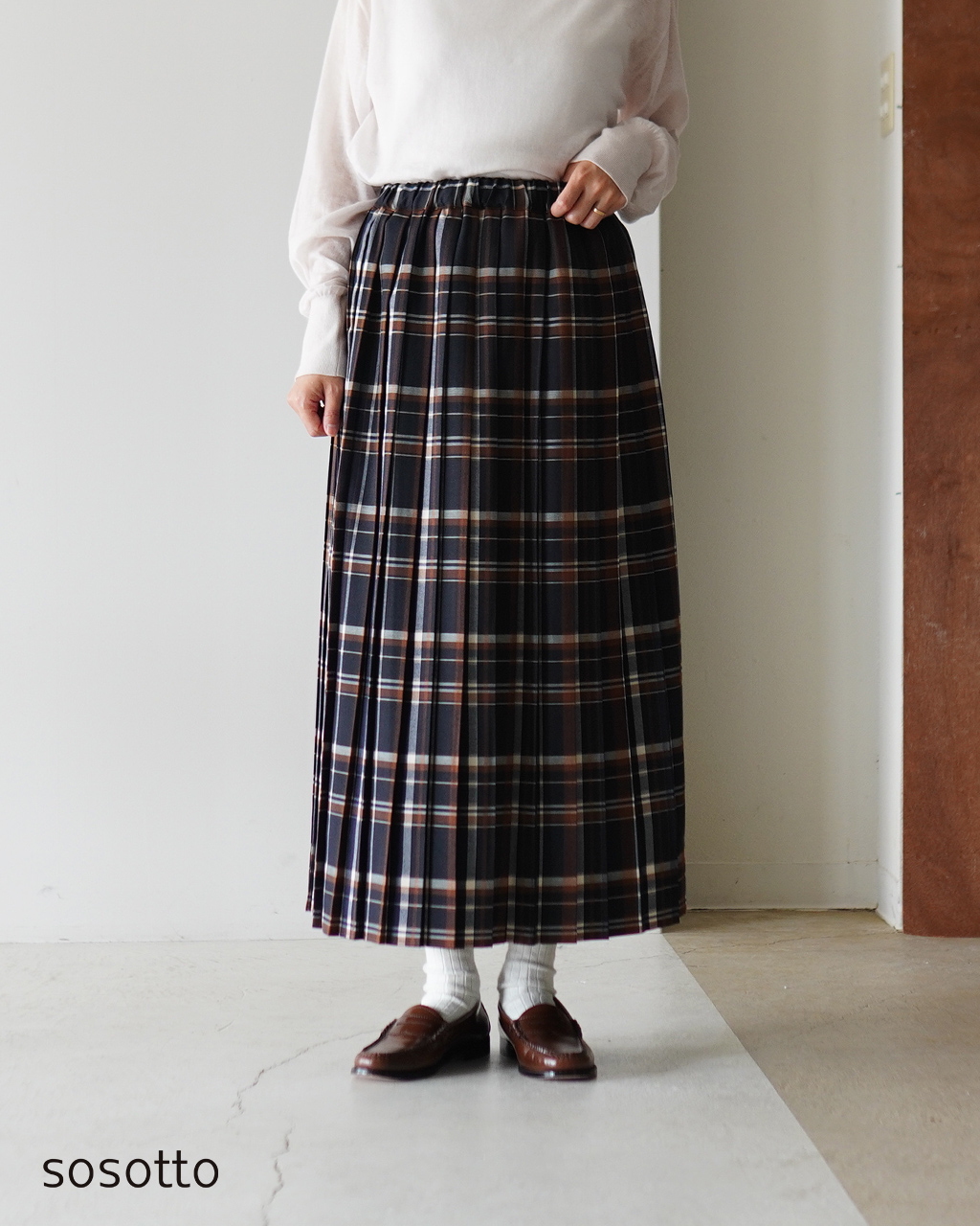 昨年好評だった、前後で異なる幅のプリーツを切り替えたチェック柄のロングスカート。ウエストはゴム仕様で楽に穿け、紐でサイズ調整も可能です。しっかりとしたハリ感のある生地が秋冬のコーディネートを上品に演出します。ニットやブーツを合わせてクラシカルに、スウェットやスニーカーを合わせてカジュアルにと、幅広く活躍。切替位置をずらすことでプリーツの表情の違いも楽しめます。落ち着きあるカラーで着回しやすさも抜群です。