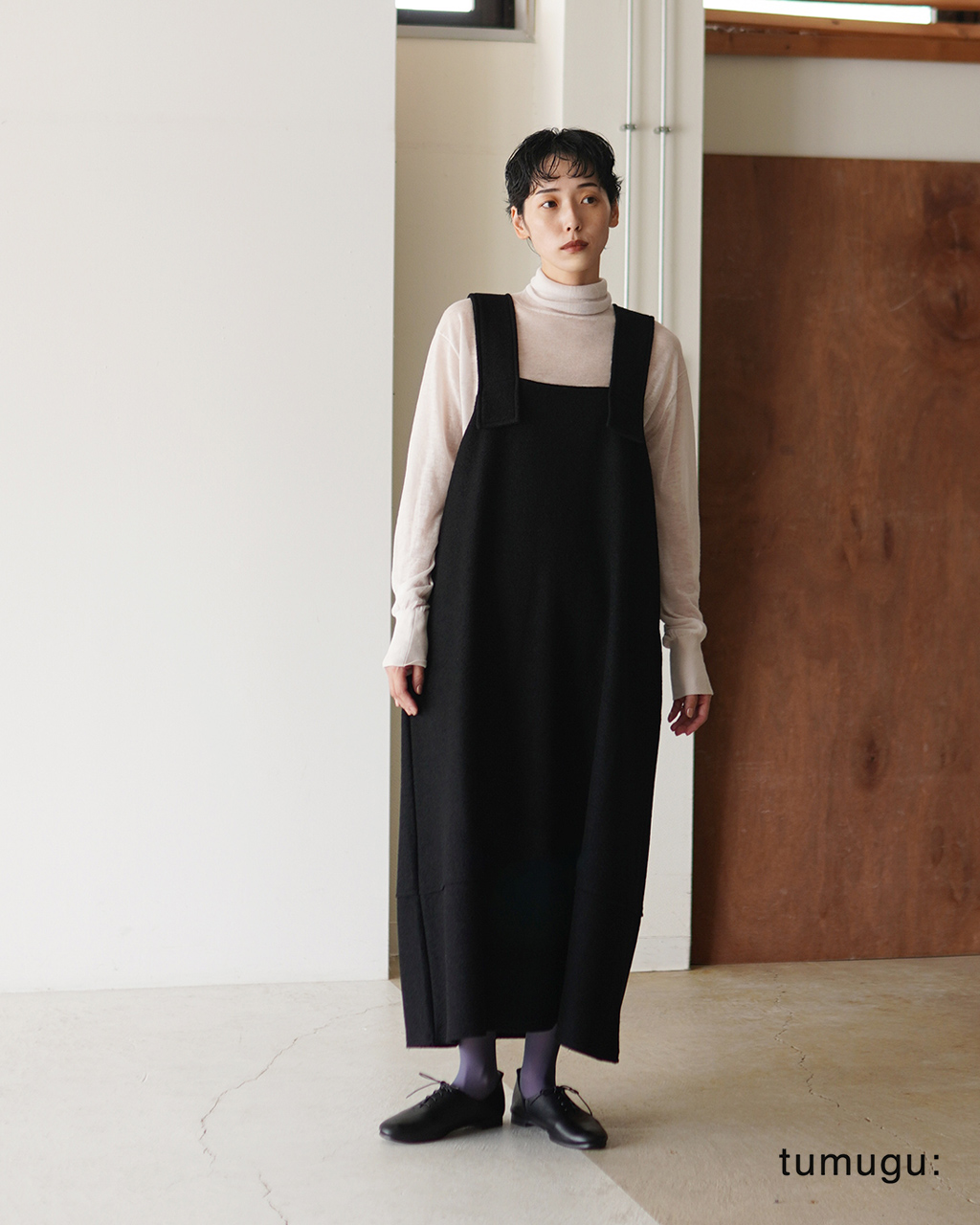 落ち感のあるジャンパースカートに、淡いトーンのライトアウターと透け感タートルを重ねて。軽やかさと奥行きが共存する、シーズンらしい洗練スタイルです。