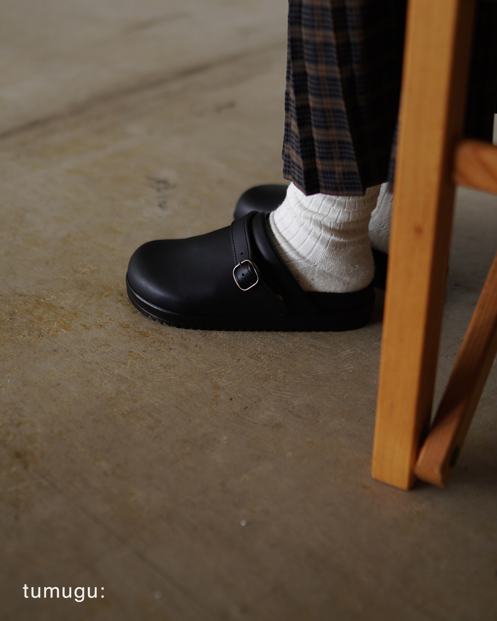 日常に溶け込むナチュラルな佇まいと、上質な革の風合いを楽しめるサボ。オイルをたっぷり含んだ国産牛革を使用し、しなやかさとほどよいコシ感を兼ね備えています。裏地を付けず一枚革で仕立てることで足馴染みがよく、自分だけのフィット感に育っていくのも魅力。足の形に沿った木型とクッション性のあるフットベッドが、つま先の負担を軽減し快適な履き心地を叶えます。可動式ベルトは前にするとミュールサボとして、後ろにするとバックベルトとして使え、スタイルや気分に合わせたアレンジが可能。丁寧な作りのこだわりが感じられる、ツムグならではの一足です。