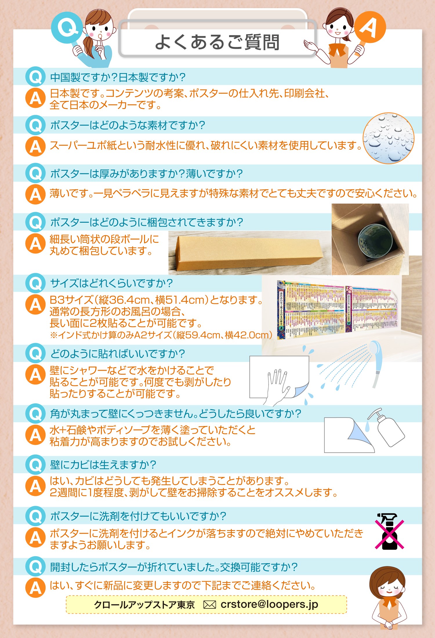 お手入れ:カビ防止のため2週間に1度程度、剥がして壁のお掃除をおすすめします。(ポスターには洗剤を付けないようお願いします)