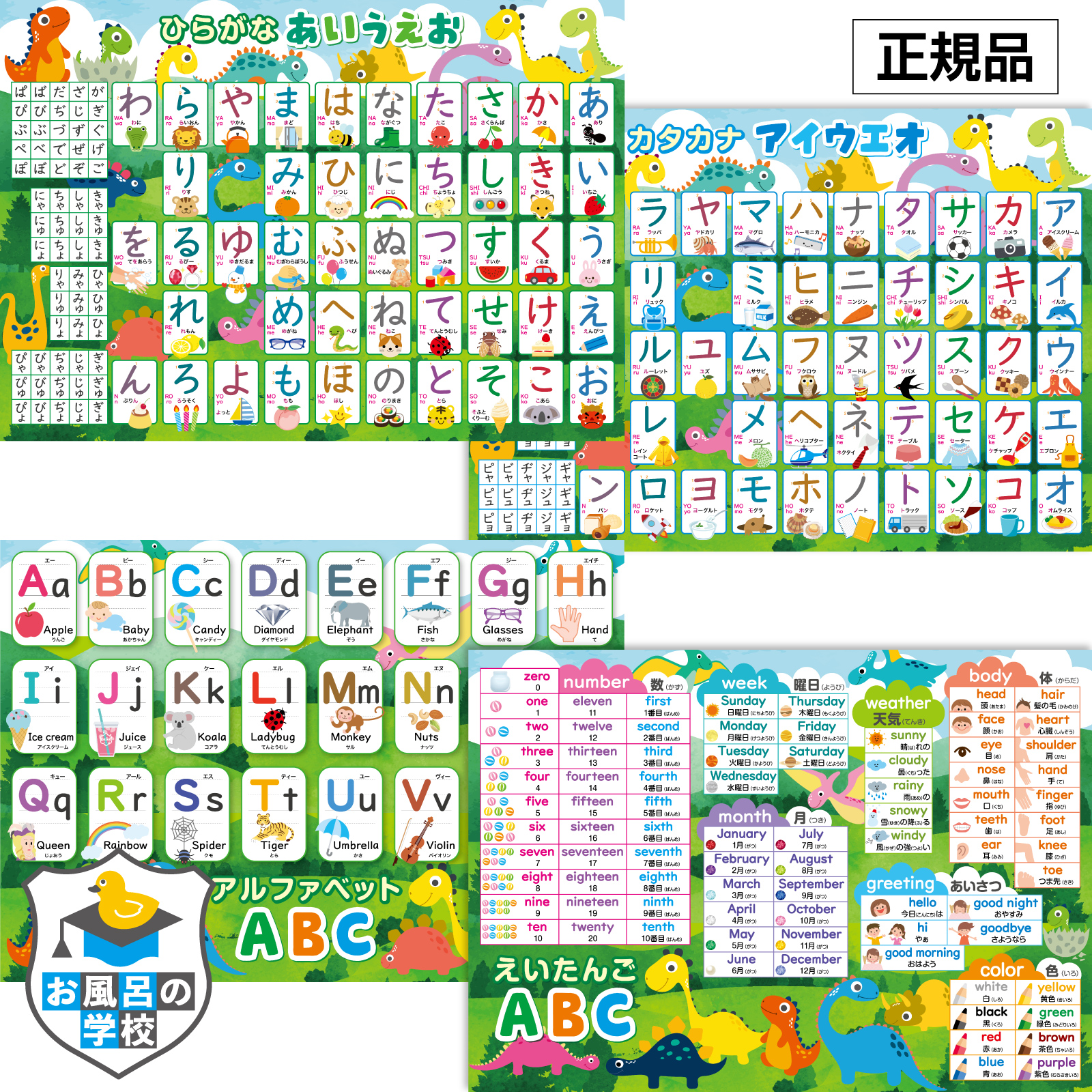 お風呂の学校 ひらがな&カタカナ&アルファベット 恐竜 お風呂ポスター 4枚セット お受験 知育 学習 B3サイズ あいうえお表 ABC表 防水