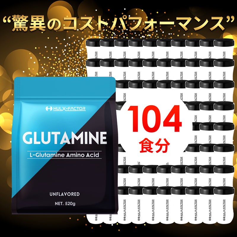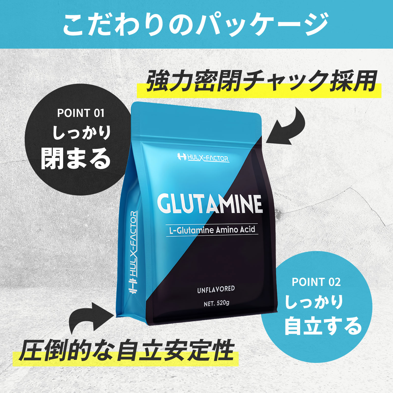 【プロも納得!純度100%の高品質】L-グルタミン 520,000mg配合!(1回あたり目安5,000mg)。グルタミンパウダーは本気でトレーニングに挑むあなたの日々のコンディションを整えてくれる重要な成分です。ハルクファクターは純度「100%」というプロフェッショナル品質のピュアフリーフォームパウダーを使用いています。