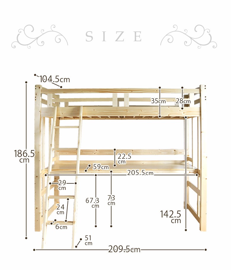[ベッド本体]幅 104.5×奥行 209.5×高さ 186.5cm デスク天板の高さ 73cm
