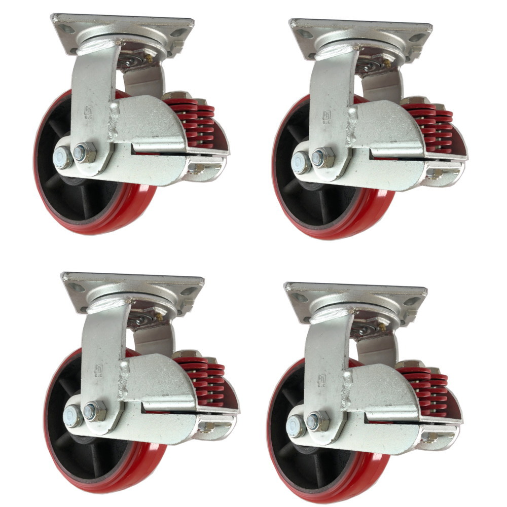 150mm 重荷重用 けん引用 スプリング 自在キャスター ポリウレタン車輪 150J-PCC-WR 4個セット 台車・荷車の補修用 中部産業