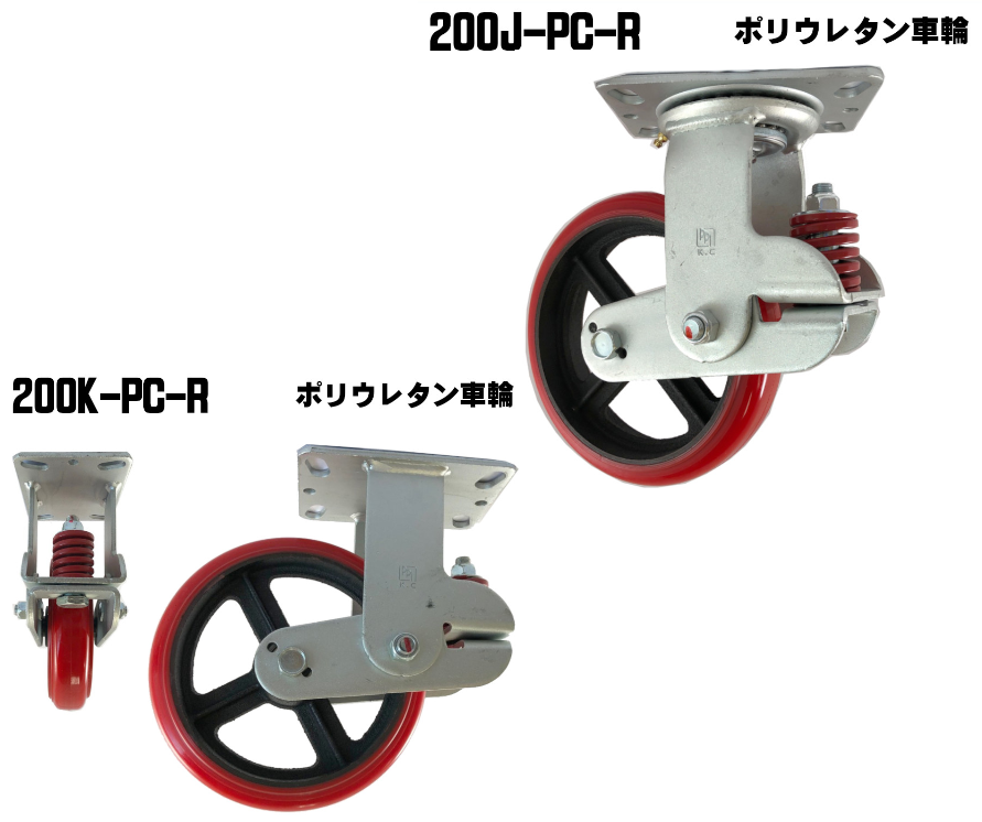 200mm スプリング 自在・固定 各1個 ポリウレタン車輪 200J/K-PC-R 手押し/けん引兼用 台車・荷車の補修用 中部産業