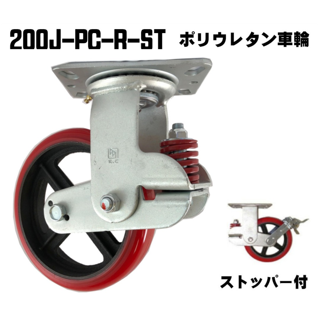 200mm スプリング 自在キャスター 耐荷重400kg ストッパー付き ポリウレタン車輪 200J-PC-R-ST 手押し/けん引兼用 台車・荷車の補修用 中部産業