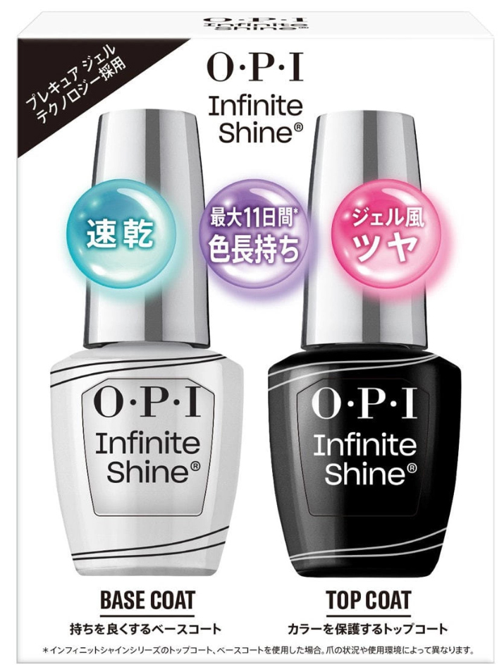 OPI インフィニットシャインシリーズの爪を保護するベースコートと、色持ちをよくするトップコートのセットになります。