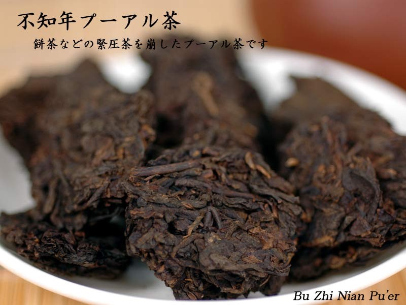 餅茶などの緊圧茶を崩したプーアル茶(10年)ですプーアル茶は発酵度が高い後発酵茶で【黒茶】と呼ばれます。かび臭さと苦味が特徴の中国茶で、苦手な方も多いお茶です。保存をしっかりすれば時間が経つほどにまろやかさが増し、ワインのように古ければ古いほど価値が出るとされています。中国で特に広東省や香港などでは体内の脂肪分を洗い流す効果があるとされ食事の後で良く飲まれています。ダイエットに効果があるとTVなどで紹介されてから、日本でも一気に売行きが広がりました。