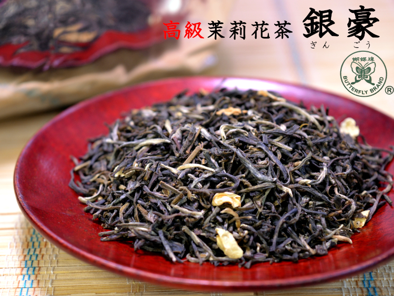茉莉花茶は緑茶の茶葉に茉莉花(ジャスミン)の花の香りを吸着させたお茶です。ジャスミンの香りは気持ちを静めてリラックスさせる効果があると言われ、女性を中心に人気があります。本商品の茉莉花銀豪(ぎんごう)は福建茶葉公司製造の茉莉花茶の中でもきりっとした清らかな香りが特徴の高級ジャスミン茶です。輸入時の原料袋には「胡蝶牌」正規品であることを証明するホログラムシールが貼られています。