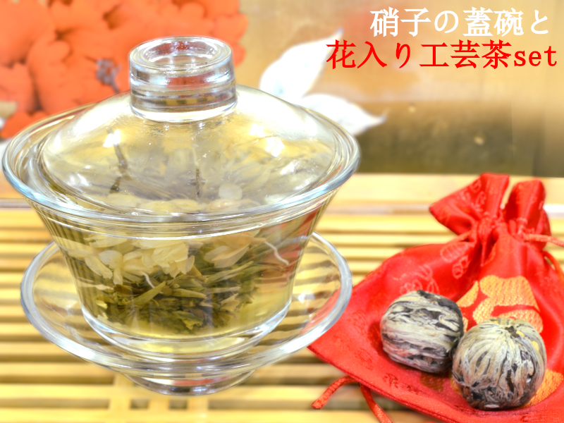 目で見て楽しめる人気の花入り工芸茶とガラスの蓋碗のセットです。花入り工芸茶を試してみたいという方にお勧めのスタートセットです。工芸茶2粒をサテンの巾着袋にお入れして発送致します。ご自分で楽しむ他、親しい方へのちょっとした贈り物、中国茶館や中華料理店にも!