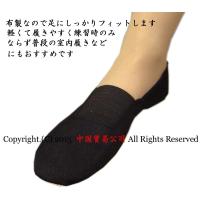 武術練習用の室内シューズです。非常に薄手で中央にゴムが入っているので、足にしっかりフィットし、地面との接地面がダイレクトに伝わってきます。足指で地面を掴む感覚が必要な武術を練習するのに最適です。軽くて薄いので室内普段履きなどにもご使用頂けます。
