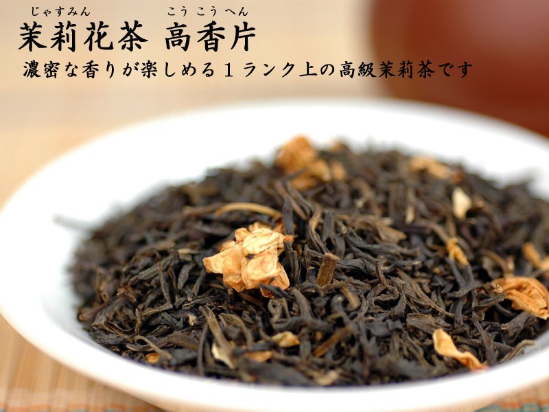 茉莉花茶は緑茶の茶葉に茉莉花(ジャスミン)の花の香りを吸着させたお茶です。ジャスミンの香りは気持ちを静めてリラックスさせる効果があると言われ、女性を中心に人気があります。 本商品の茉莉花高香片(ガオシャンペン)は茉莉花茶の中でも特に香りに重きを置いて作られたお茶です。濃密な香りと爽快な飲後感が特徴の1ランク上の茉莉花茶です。