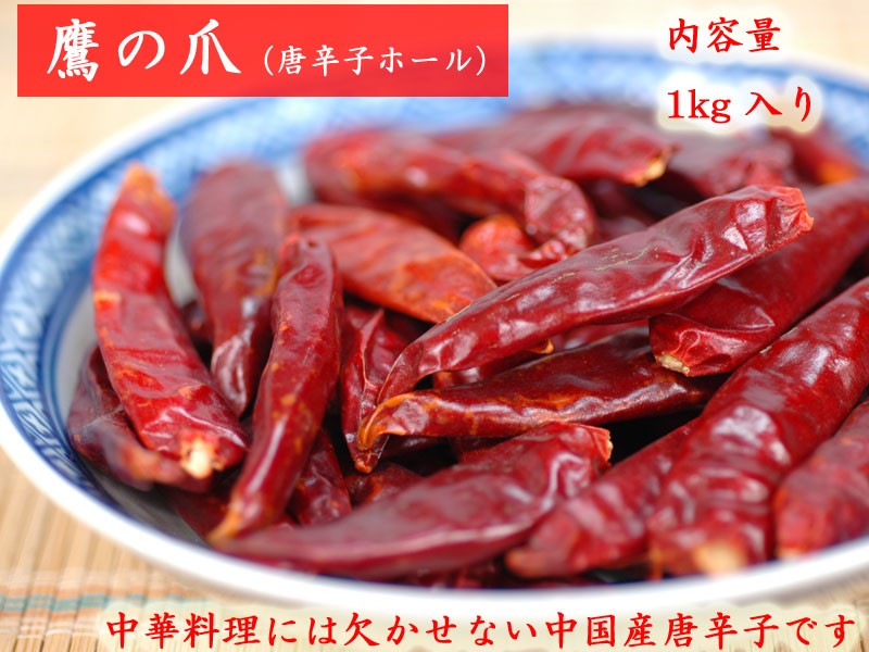 辣椒(鷹の爪)はその形が鷹の爪に似ているためこう呼ばれる中国産の唐辛子です。中華料理では鶏肉の唐辛子炒めなどに使用されます。最近ではカイエンペッパーなどと呼ばれたりします。流行りの火鍋や激辛料理には欠かせません。