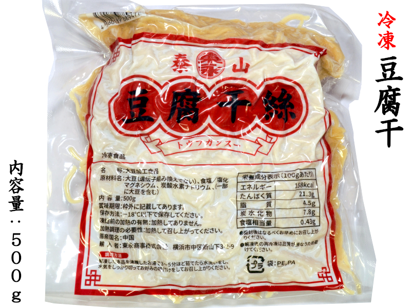 豆腐干(とうふかん/ドウフーガン)とは、水分をしっかり抜いて圧縮・乾燥させた中国由来の豆腐加工品です。食感は非常に硬め・弾力があり、湯葉や干し豆腐に近い食感です。味はほぼ無味(大豆の風味のみ)で、主に中国料理で使用されます。細切りにして 凉拌(和え物)や炒め物( ピーマン・肉・香辛料と一緒に)、スープ・鍋などの具材にも。本商品は業務用の冷凍豆腐干500gです。