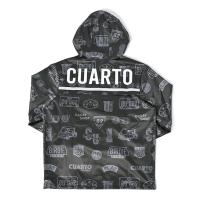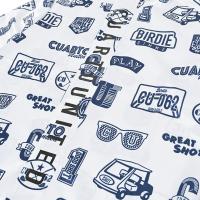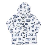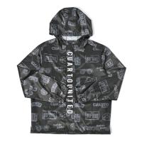 ロゴやアメリカンテイストなモチーフがちりばめられた、ジャケットとパンツが上下セットになったレインウェア。