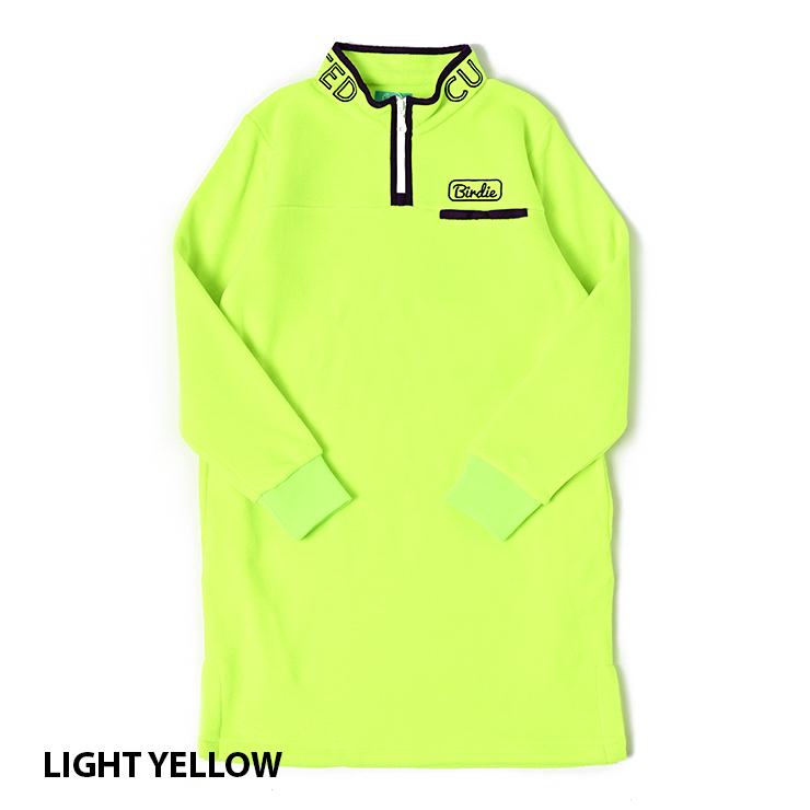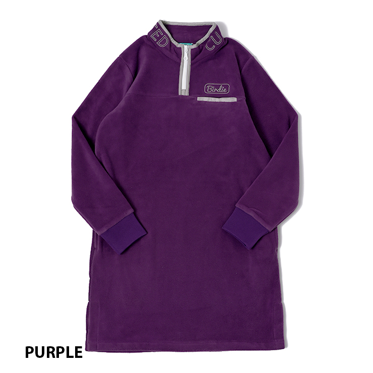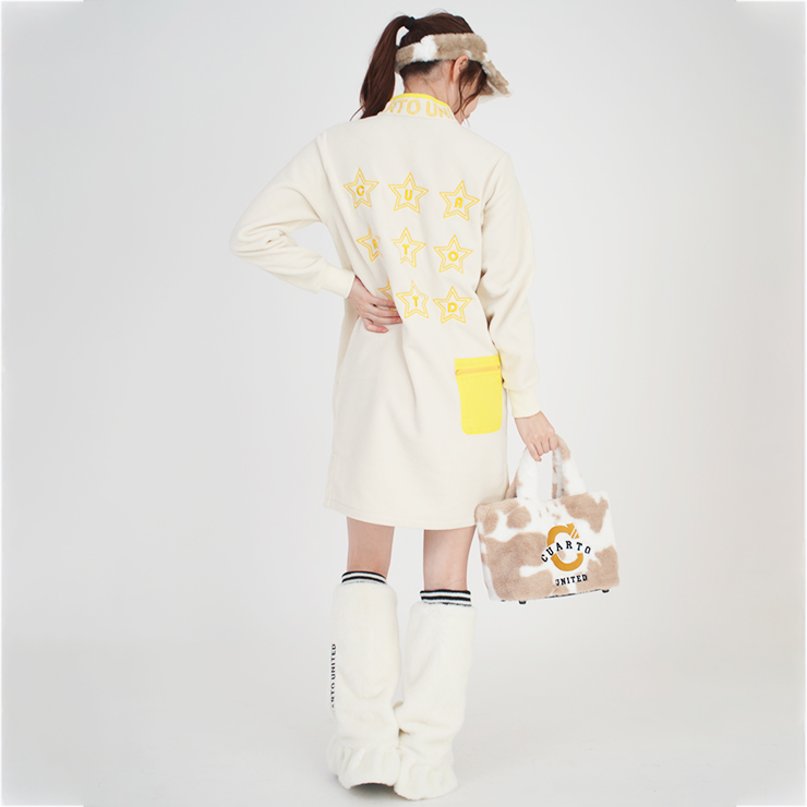 背中に均等に並べられた星ロゴ刺繍と首周りのロゴ刺繍がポイントのハーフジップフリースワンピース。