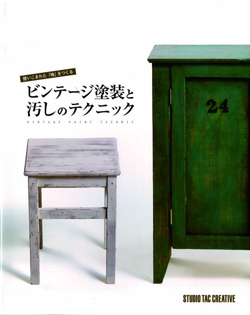 本書では、オリジナルで製作した家具や既製品の家具を、塗装の技術でビンテージ風味に仕上げてしまうという方法を紹介しています。