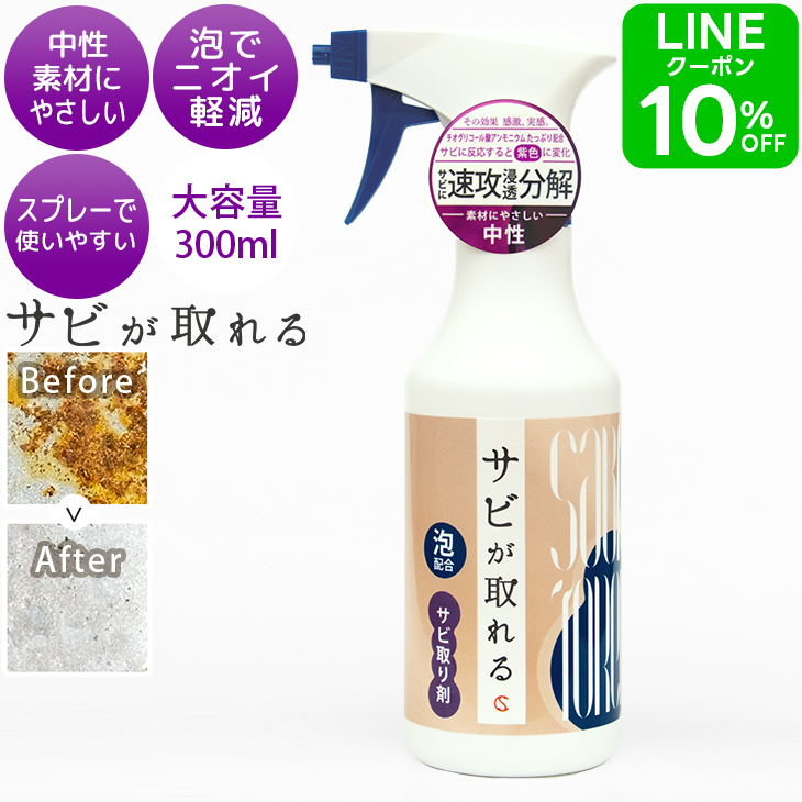 | サビが取れる 泡スプレー 300ml (中性) サビが取れる泡スプレーは、チオグリコール酸アンモニウムをたっぷりと配合だからサビを瞬時に分解。 しっかりした泡の液剤は、中性だから素材を痛めず、臭いが少ない成分。 サビに反応すると紫色に変色しますが異常ではありません。 |
