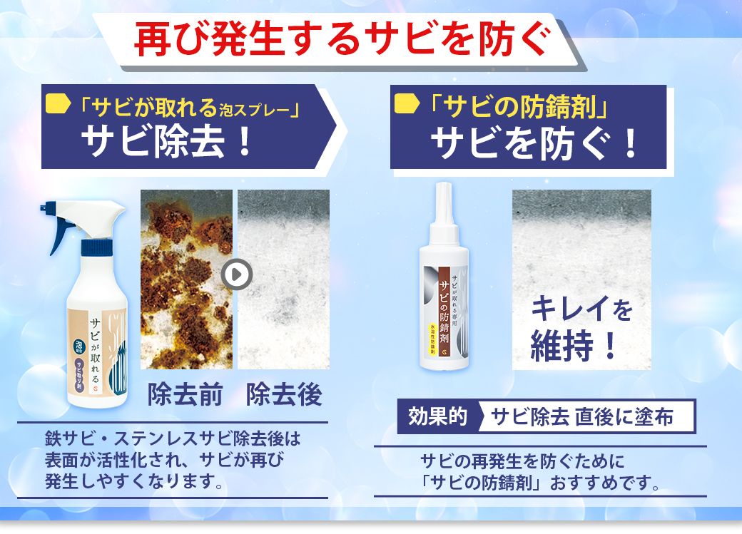 | 水回り・もらいサビ・鉄粉・車・自転車・バイク・配管・工具・建具・生活用品・ゴルフクラブ・釣具・その他一般サビ |