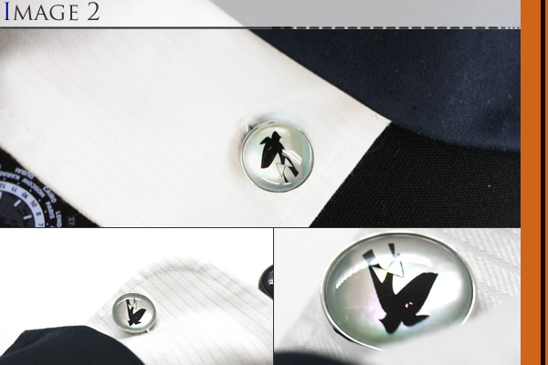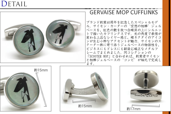 ブランド創業40周年を記念したスペシャルモデル。サイモン・カーターの“空想の相棒”ジェルベースを、虹色の艶を放つ白蝶貝の上にシルエットで描いたカフリンクスです。光の角度で表情が変わる上品なレイヤー感と、蝶ネクタイのアイコンが生む小粋なアクセントが魅力。サイモンのスクーター旅に寄り添うジェルベースの物語性を、ビジネスにもドレスにも馴染む端正なメタルフレームでまとめました。同コレクションの「SCOOTER MOP」と合わせれば、創業者サイモンと相棒ジェルベースの“コンビ”が袖元で完成します。